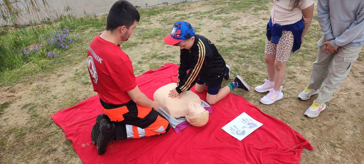 Dużym zainteresowaniem cieszyły się również zajęcia prowadzone przez pracownika Oddziału Rejonowego Polskiego Czerwonego Krzyża w Kole, który wprowadził dzieci w podstawy udzielania pierwszej pomocy. Uczestnicy mogli praktycznie przećwiczyć resuscytację na specjalnym manekinie oraz nauczyć się, jak bezpiecznie wyjąć kleszcza.