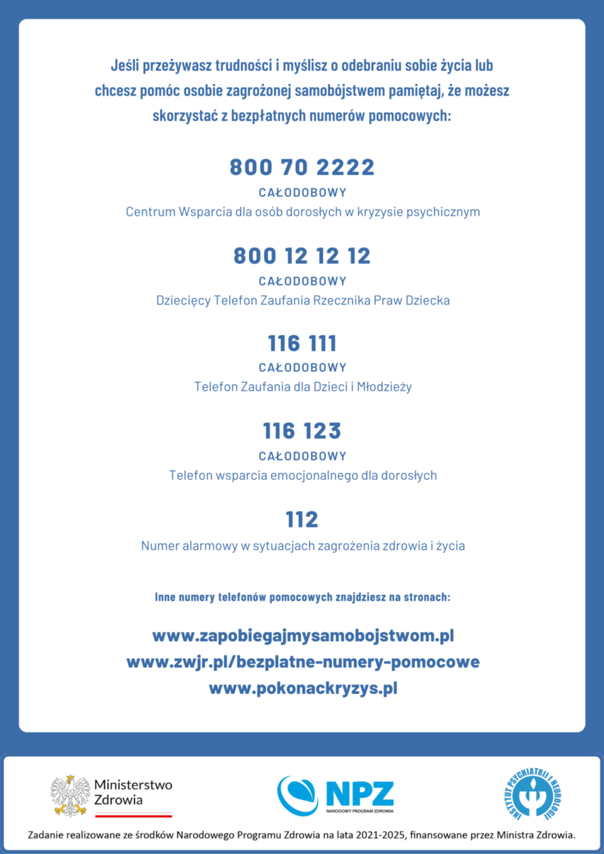 Pamiętajmy – kiedy potrzebujemy wsparcia, warto o nie poprosić. Każdy z nas może znaleźć się w sytuacji, w której emocje lub problemy zaczynają nas przerastać. Bywa, że nie potrafimy samodzielnie poradzić sobie z trudnymi przeżyciami. Jeśli czujemy bezradność, przytłoczenie czy narastające problemy osobiste, nie zostawajmy z tym sami.
