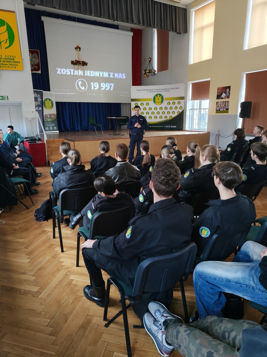 W poniedziałek mundurowi spotkali się z uczniami klas mundurowych Zespołu Szkół Rolnicze Centrum Kształcenia Ustawicznego w Kościelcu. Podczas wizyty przybliżyli młodzieży realia codziennej służby, opowiedzieli o ścieżce rekrutacji oraz odpowiedzieli na pytania dotyczące pracy w Policji. Spotkanie było także okazją do wymiany doświadczeń i rozwiania wątpliwości związanych z wyborem tej wymagającej, ale dającej dużą satysfakcję drogi zawodowej.